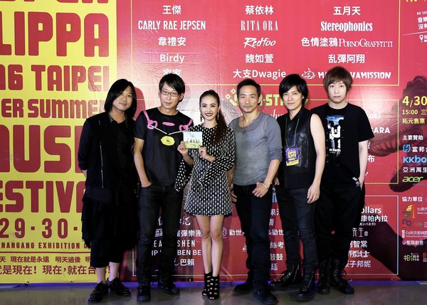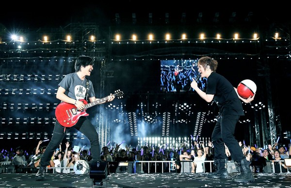 ▲台北「超犀利趴」,阿信穿上「JUST ROCK IT 2016」演唱會限定「倔強米奇T」登台演唱,五月天並與Jolin蔡依林合影。(圖/翻攝自五月天Mayday、五月天阿信粉絲專頁)